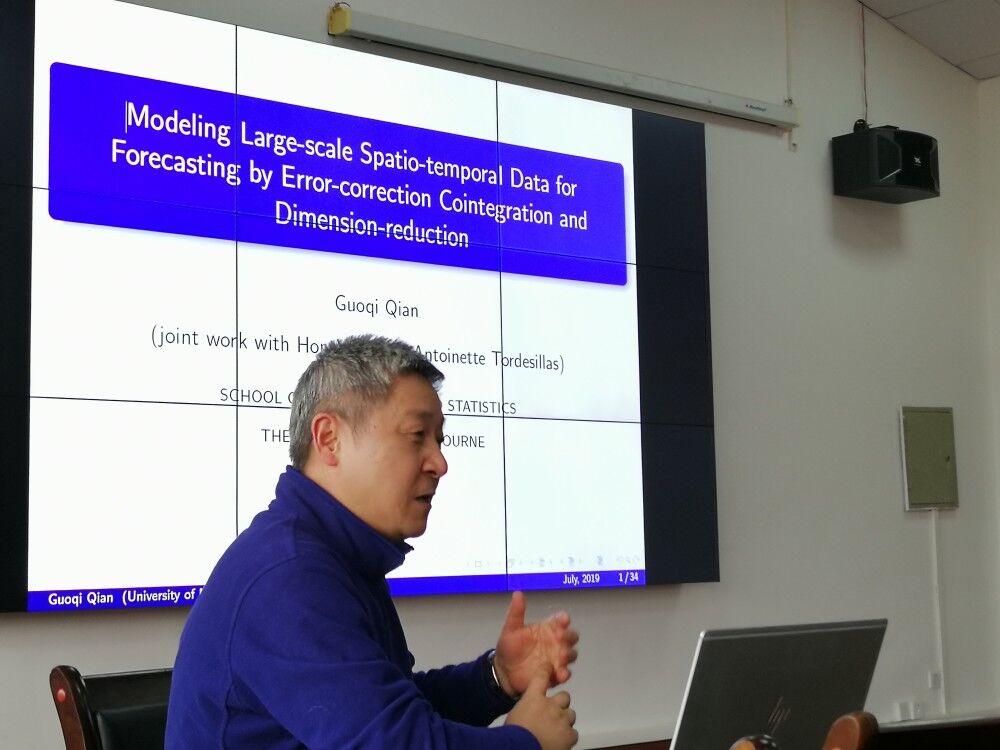 钱国祺教授于1987年在中国科学技术大学获得学士学位,1994年在加拿大达尔豪斯大学获博士学位,2009年至今在澳大利亚墨尔本大学任教。本次报告中,钱教授重点介绍了其团队最近开发的随机时空协整框架,通过该框架可模拟高维非平稳时空过程数据中的动力学。这些数据在许多复杂系统现象的观测中很常见,例如滑坡和地震监测中的地震动数据。该研究成果为大规模和非平稳时空数据分析中的建模、降维、估计和预测提供了新的见解。尤其是在滑坡预测方面,该研究为利用高时空维数据对滑坡未来动力学进行可靠预测提供了前提条件。