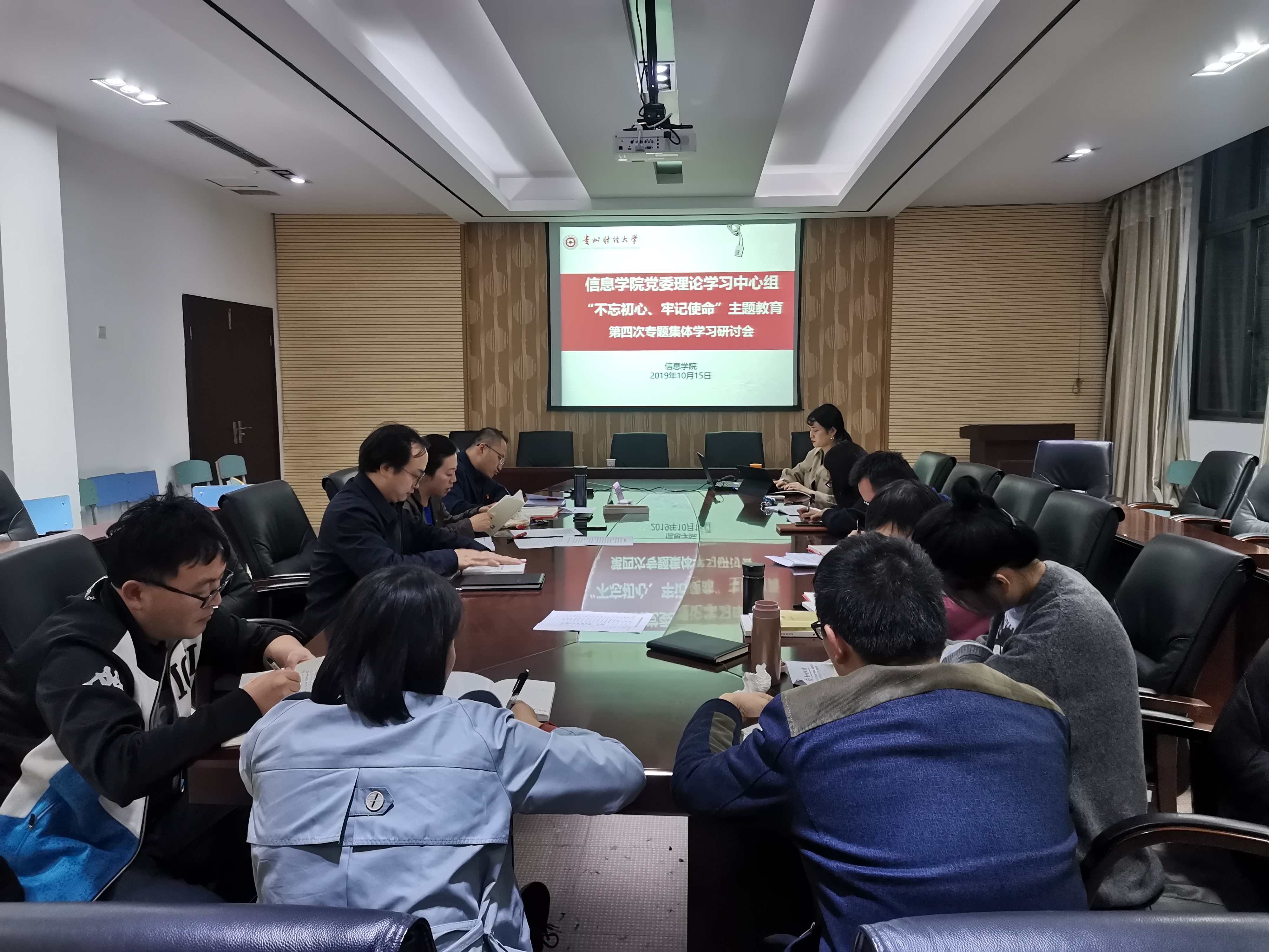 公司党委理论学习中心组于10月15日下午6点在志学楼427会议室召开“不忘初心、牢记使命”主题教育第四次专题集体学习研讨会,公司领导、各党支部书记、各科室、系负责人,卿春主持会议。
