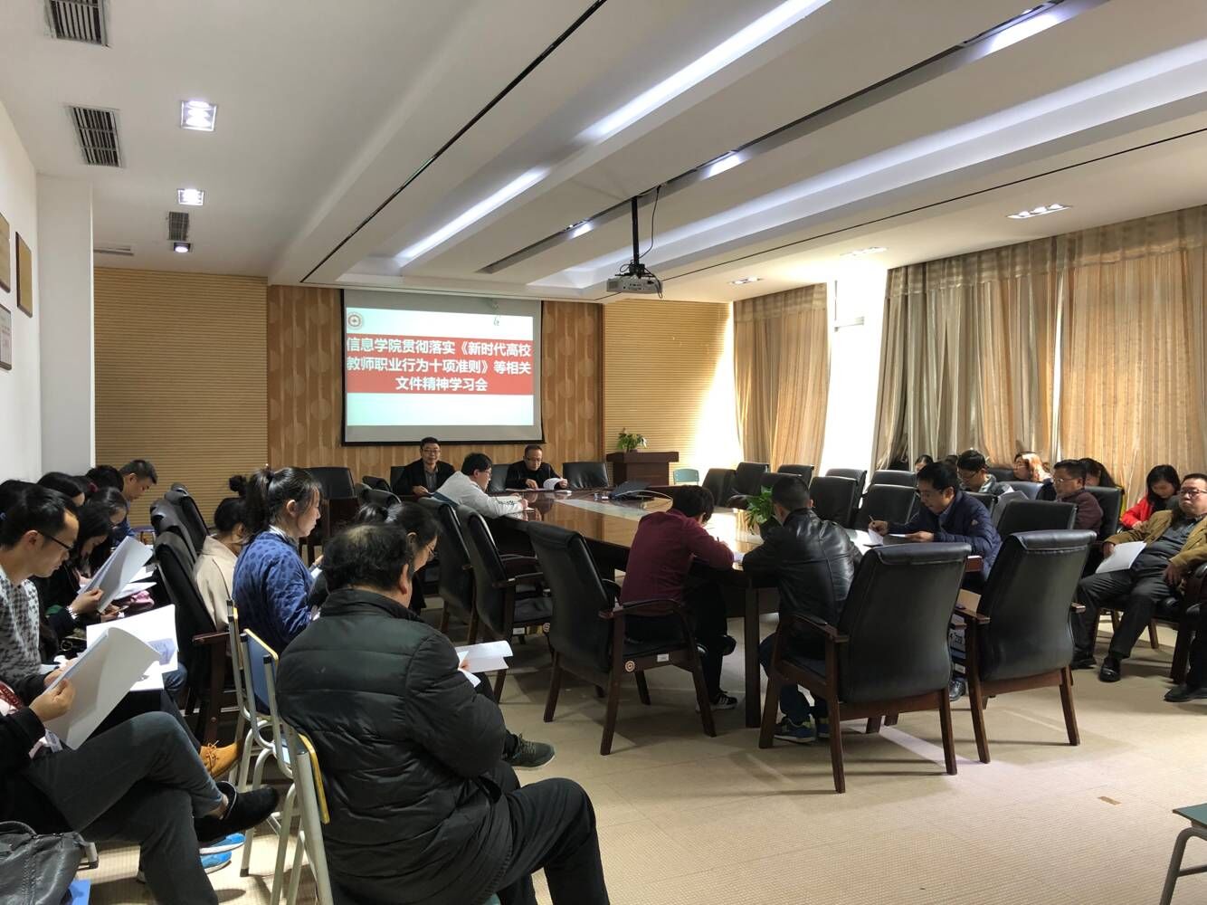 本网讯:(路庆东 报道︱摄影 张定义)2019年3月19日,2026世界杯官网在志学楼427会议室召开贯彻落实《新时代高校教师职业行为十项准则》等相关文件精神学习会。公司党委副书记何瑞、副经理郭长睿及全体教职工参加,会议由郭长睿主持。
