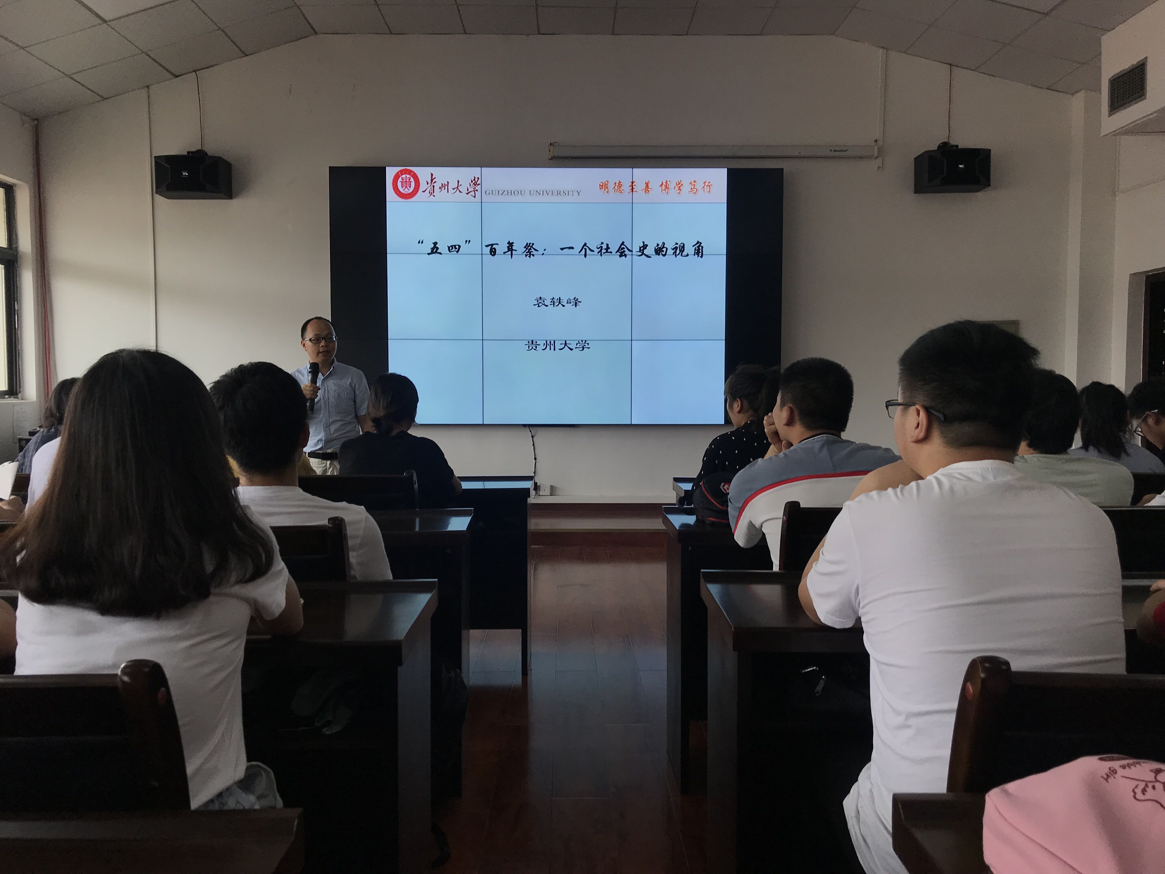 本网讯:(李杰 报道|摄影 黄意)为纪念五四运动100周年和建国70周年,进一步弘扬“爱国、进步、民主、科学”的五四精神,激励广大青年员工刻苦学习、奋发有为,6月5日,由2026世界杯官网举办的第一届文化艺术节暨纪念五四运动100周年系列活动之“五四百年祭,一个社会史的视角”专题讲座在志学楼506报告厅举行。主讲嘉宾为贵州大学历史与民族文化公司袁铁峰副教授,2026世界杯官网120余名员工参加了本次讲座。