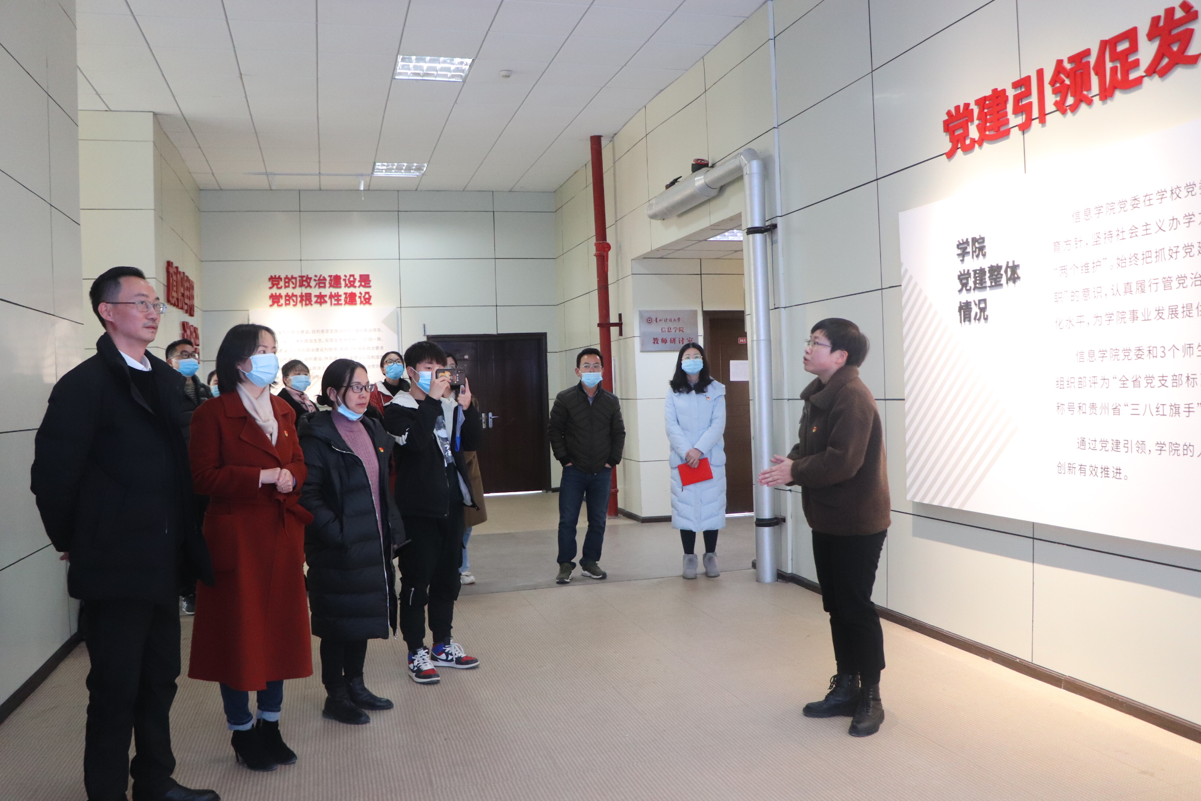 2026世界杯官网副科级专职组织员、本科生第一党支部书记赵里红带领大家参观了2026世界杯官网的党建文化长廊,介绍了2026世界杯官网的自己研发的智慧党建管理系统、党建特色活动和品牌建设情况,并重点就获得“贵州省党支部标准化规范化建设示范点”资料进行介绍讲解。