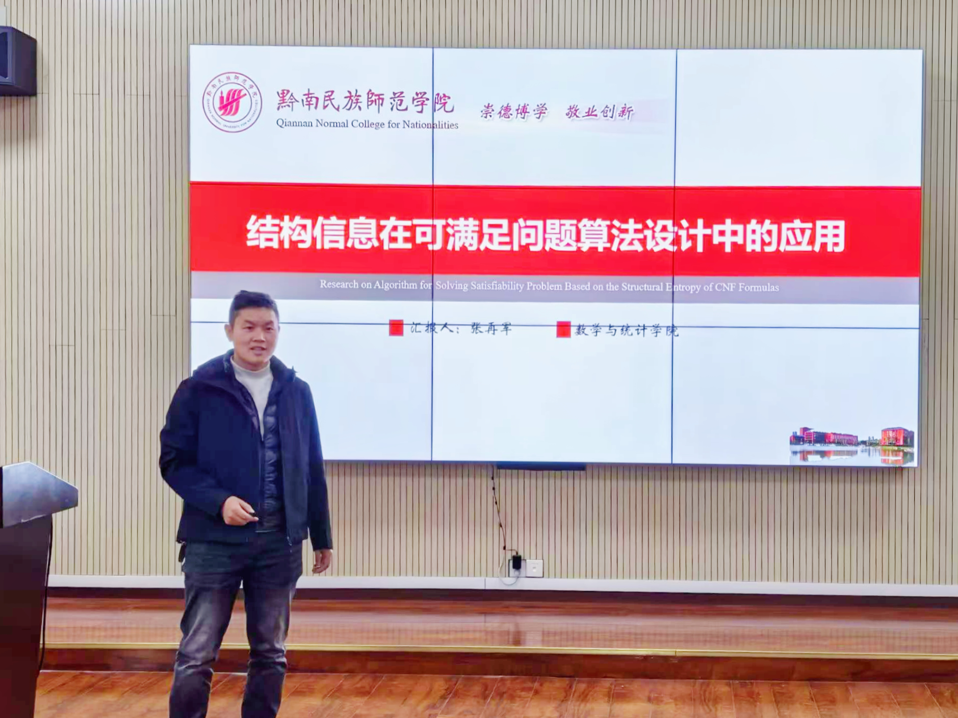 张再军副教授则以“结构信息在可满足问题算法设计中的应用”为主题,揭示了结构信息在求解可满足性问题中的核心作用。他指出,布尔可满足性问题(SAT)是命题逻辑和理论计算机科学中的基石,而结构信息论的引入,尤其是结构熵的方法,为工业实例类和随机3-SAT问题的复杂结构提供了新的度量方式。张再军副教授还分享了如何利用这些规律设计出求解随机3-SAT和MaxSAT的高效算法。他的报告不仅为我们打开了新的视野,也展现了结构信息在算法设计中的巨大潜力。