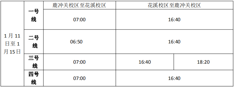 按照集团统一安排,公司鹿冲关校区、花溪校区进入期末考试阶段, 1月8日考试结束,为满足期末考试需要和行政科研工作的开展,现对交通车作如下调整: